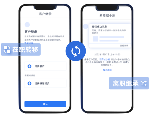 銷售離職后,離職員工企業微信添加的客戶,無需客戶同意,客戶資料、聊天記錄等自動同步,避免銷售員工離職帶走客戶,造成經營流失。