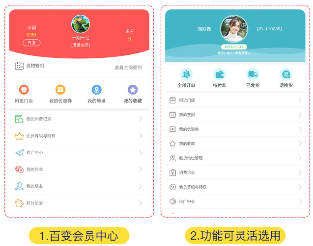 會(huì)員中心模版多樣化,支持用戶(hù)自定義。功能包含:訂單管理,地址管理,對(duì)接線下會(huì)員卡,出示會(huì)員驗(yàn)證碼,充值消費(fèi),推廣分享等諸多功能。