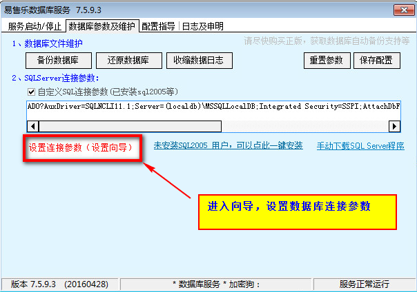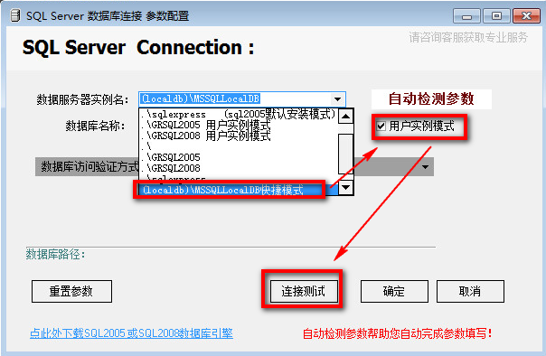2)點擊設置連接參數向導,打開后。選擇 Sqllocaldb快速方式。連接測試成功后,確定。